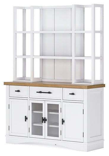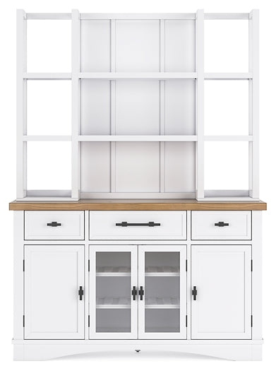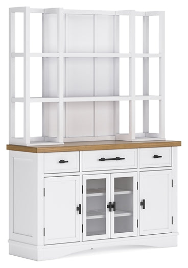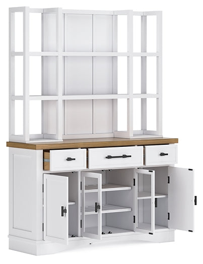 | Détails | Fabriqué avec des bois durs massifs, du placage de chêne, du bois d'ingénierie et des substrats MDF, Serveur avec finition bicolore (finition blanche ; plateau en placage de chêne de boucher avec finition naturelle), Poignées de barre en métal avec finition noire, 2 armoires à une porte (chacune avec une étagère), Armoire à double porte vitrée avec 2 étagères, 3 tiroirs coulissants en douceur avec intérieur entièrement fini, construction en queue d'aronde et fond en feutre noir, Huche avec finition blanche, 2 étagères fixes ouvertes, Assemblage requis | |