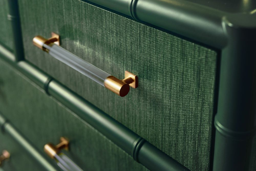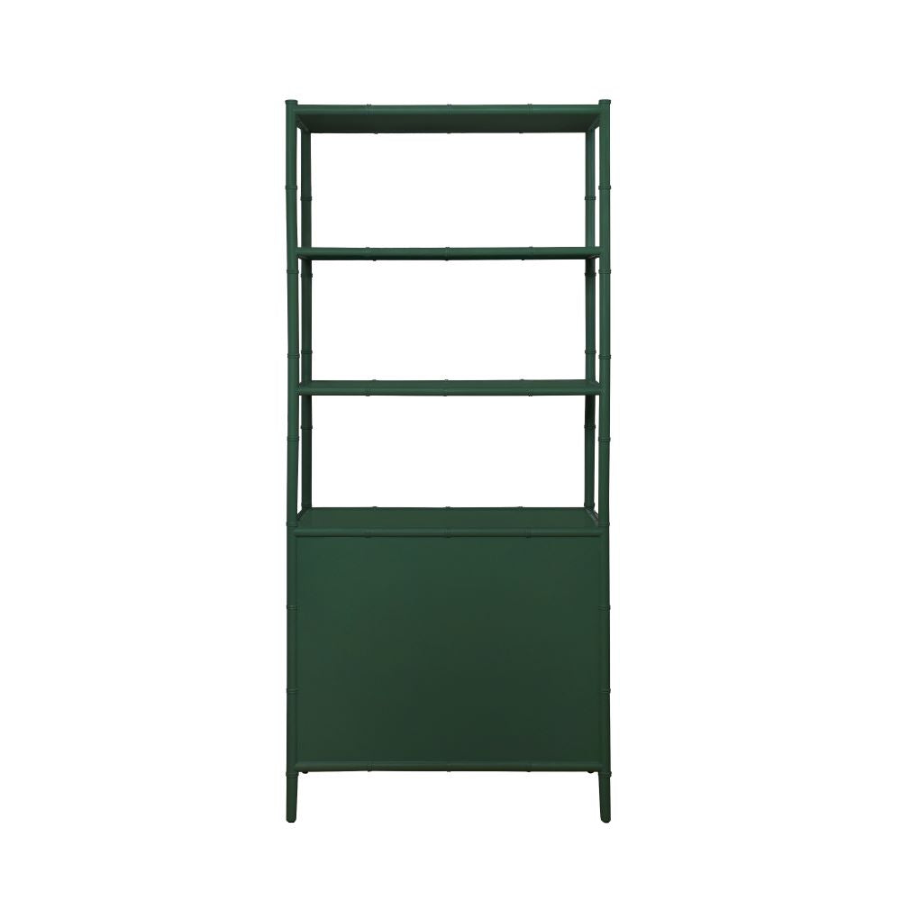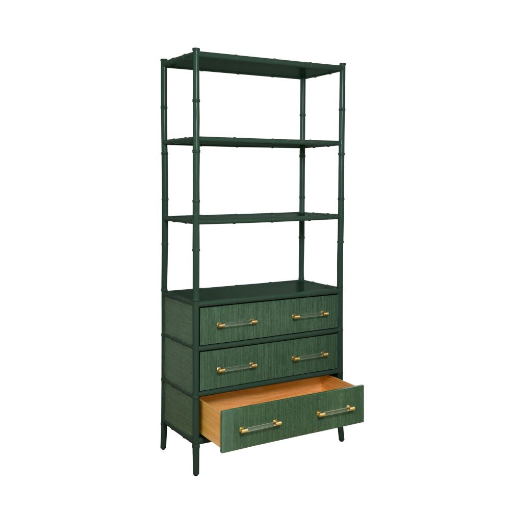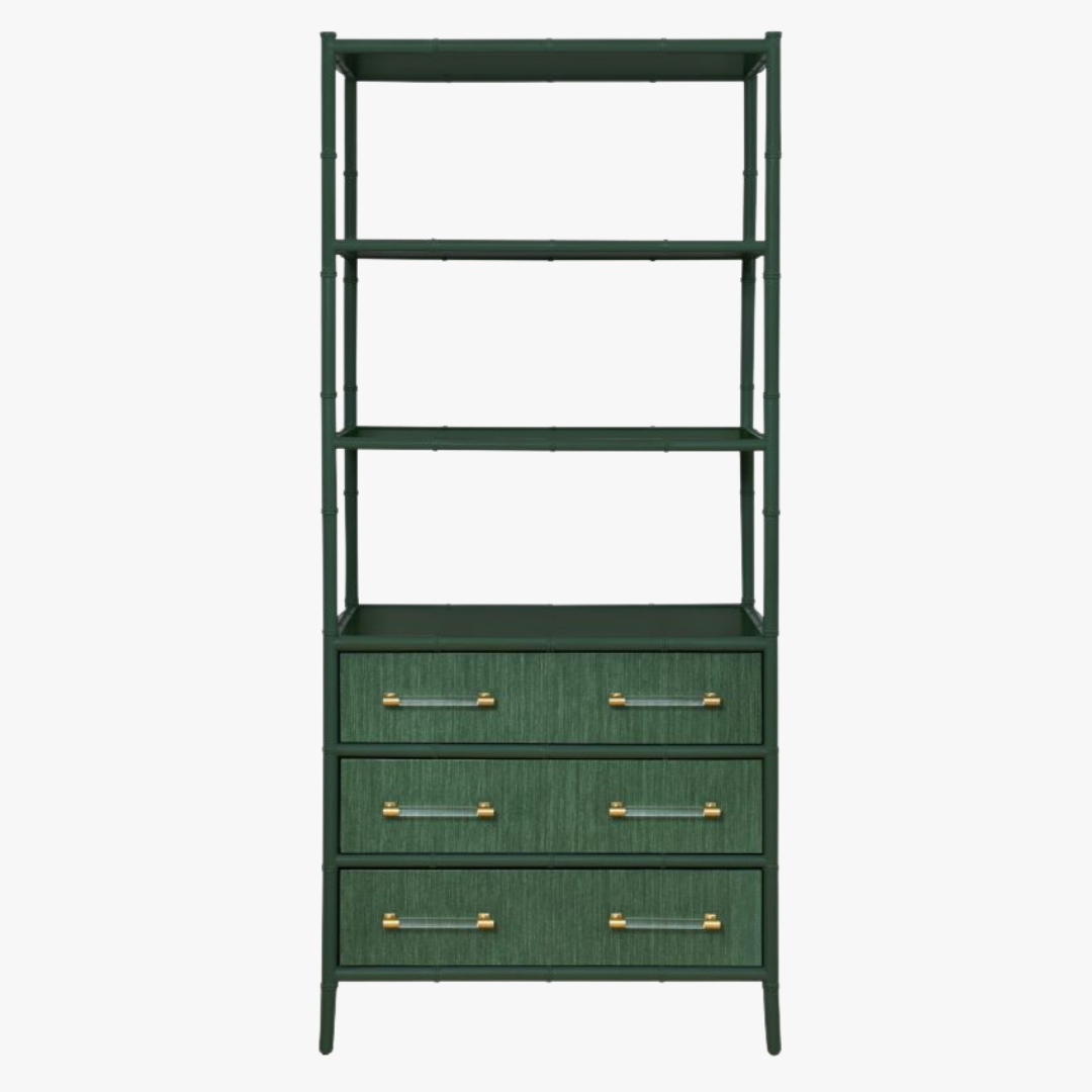 Avec sa forme classique et ses matériaux variés, l'étagère Blakewell Forest apporte style et élégance à toute pièce. Trois tiroirs spacieux, ornés de poignées en laiton et acrylique, rehaussent ce meuble de rangement intemporel en fibre végétale teintée et laqué vert foncé mat. Des pieds galbés et des détails en bambou complètent son allure design.