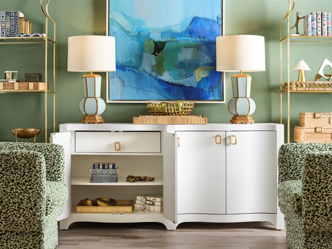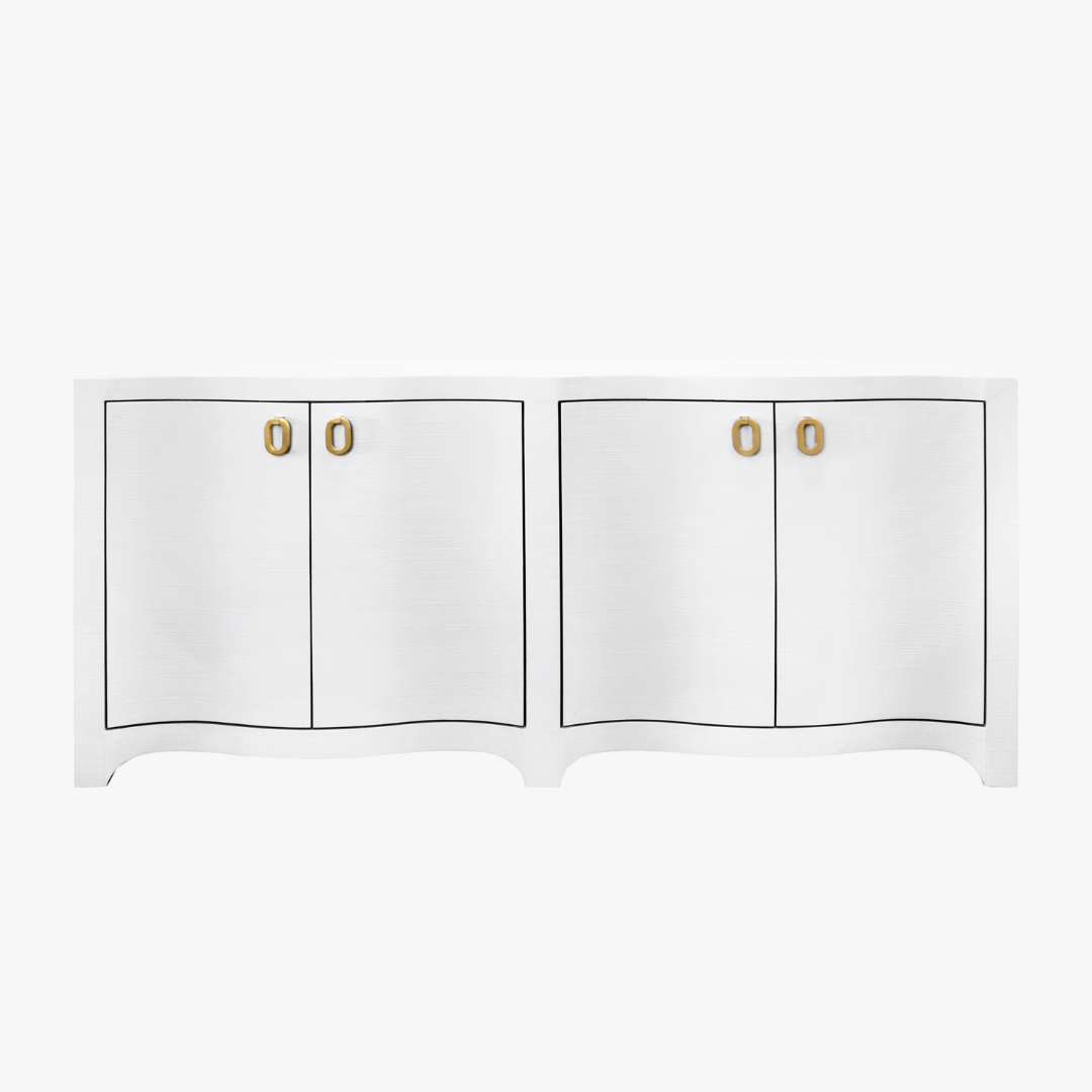 Avec ses lignes raffinées et sa texture sobre, le buffet Castella blanc apporte style et charme à toute pièce. Ses quatre portes ornées de poignées anneaux en laiton satiné soulignent la façade incurvée et la finition laquée de ce meuble de rangement classique. Ce meuble blanc intemporel s'intègre harmonieusement à tout intérieur soigné, que ce soit dans une entrée, une salle à manger ou tout autre espace de vie nécessitant une solution de rangement élégante.