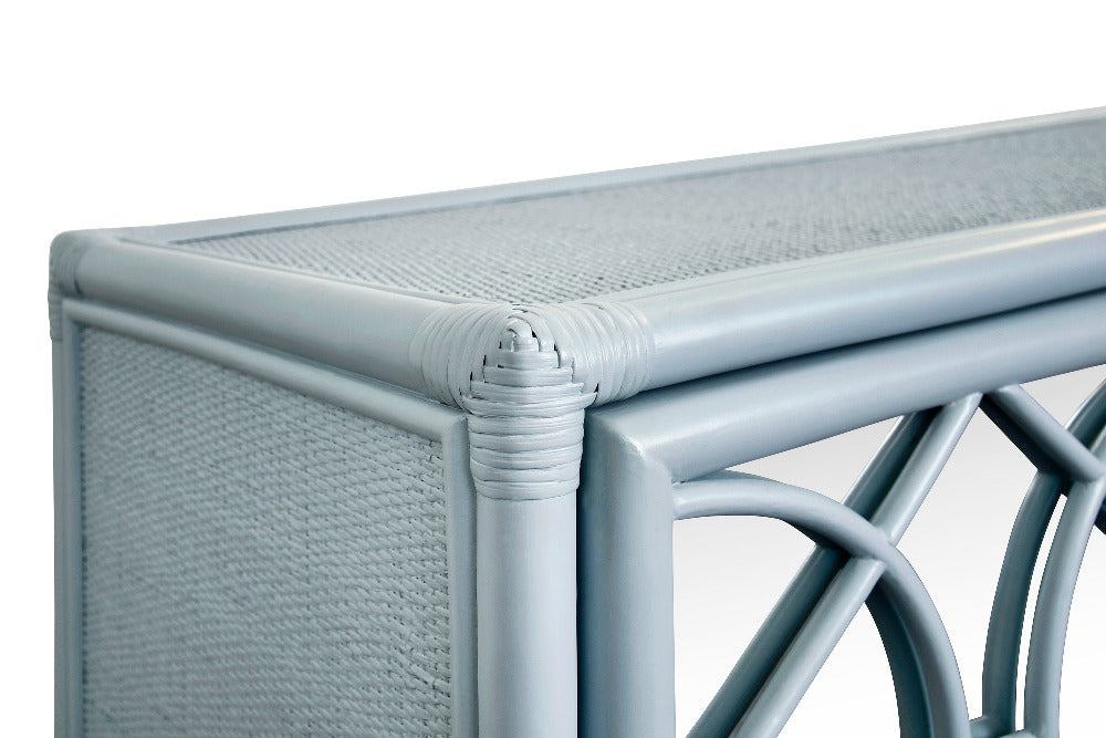 Meuble en rotin peint en bleu clair : 33 cm (H) x 51,25 cm (L) x 18,25 cm (P)