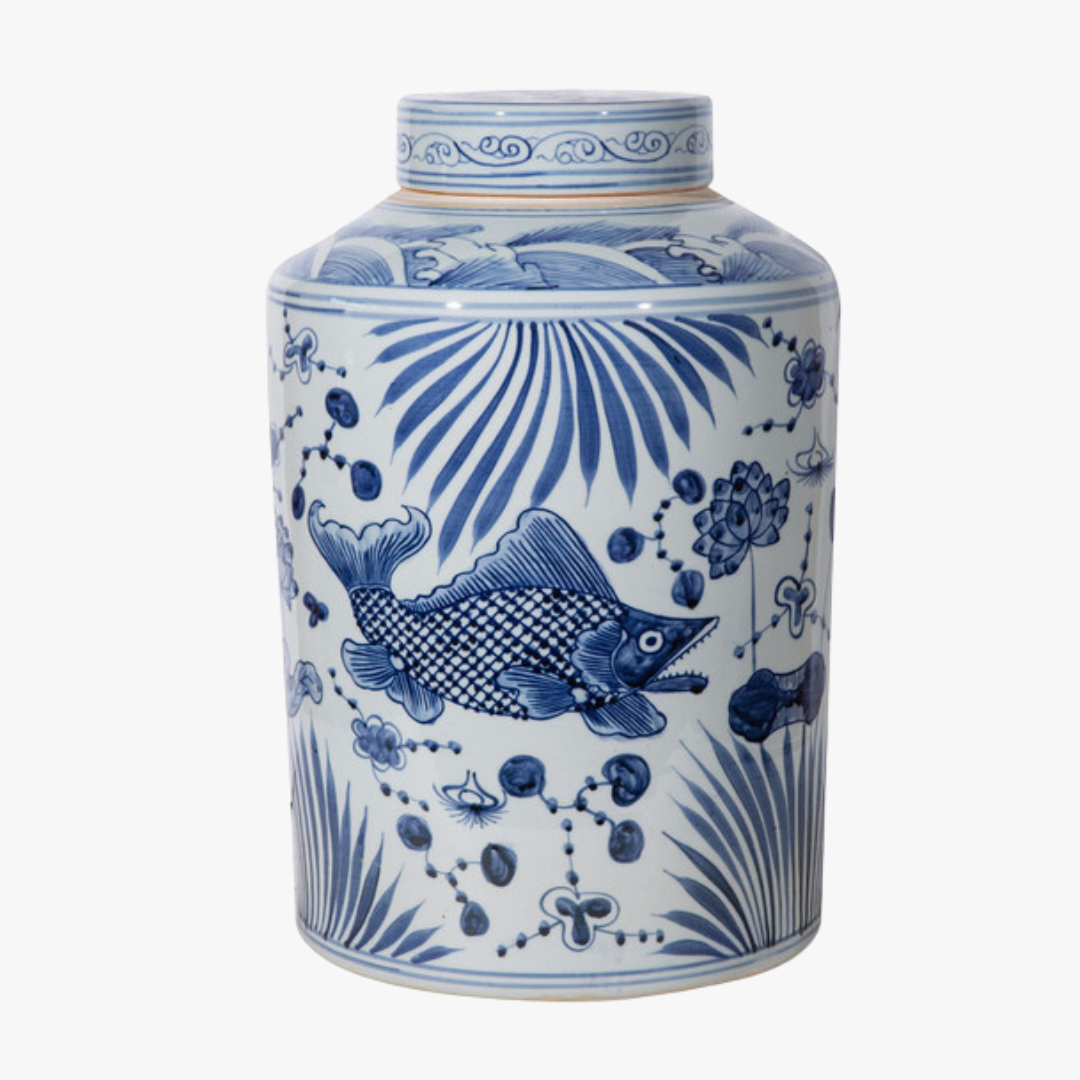 Notre grand pot à thé Poisson, d'inspiration vintage, est l'accessoire décoratif idéal pour un intérieur raffiné. Ce pot à thé en porcelaine, fabriqué artisanalement et doté d'un couvercle, arbore un motif de poissons et d'algues aux nuances de bleu éclatantes, évoquant le bord de mer. Sa finition unique, patinée, lui confère un charme antique. De petits éclats et des variations de couleur sont inhérents à sa conception.
