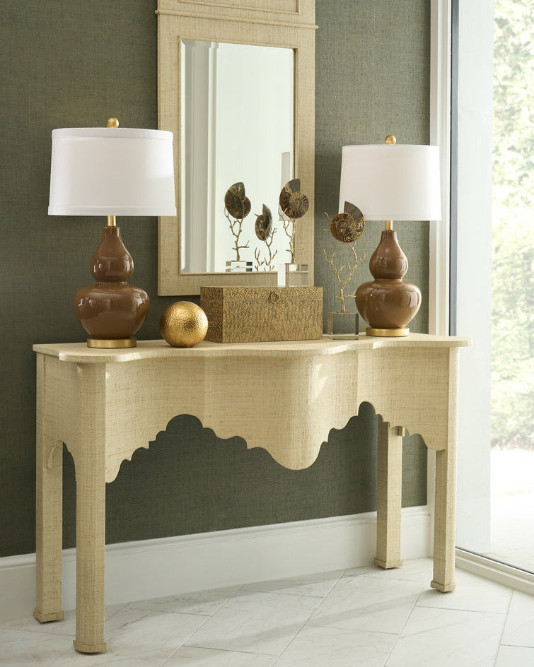 Notre console Kensington en raphia, d'inspiration antique, revisite avec modernité le design classique du mobilier anglais de l'époque George II. Son élégante table console aux bords festonnés texturés apportera une touche intemporelle à tout intérieur raffiné, qu'il s'agisse d'une maison de bord de mer ou d'un appartement urbain chic. Création de Jamie Merida.