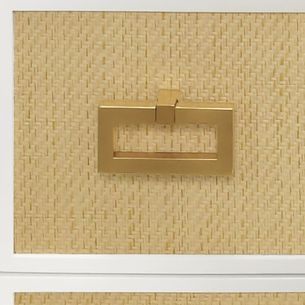 Sublimez votre intérieur avec notre table de chevet Litchfield Natural, un parfait mélange d'élégance intemporelle et de sophistication moderne. Cette table d'appoint polyvalente à trois tiroirs présente une structure en laque blanche mate et des panneaux incrustés de tissu texturé en fibres naturelles. Les poignées surdimensionnées en laiton vieilli ajoutent une touche raffinée, faisant d'elle une pièce maîtresse dans n'importe quelle pièce. Placée à côté d'un lit ou d'un canapé dans le salon, cette table d'appoint polyvalente à trois tiroirs apporte une sensation de luxe discret et met en valeur tout intérieur soigné.